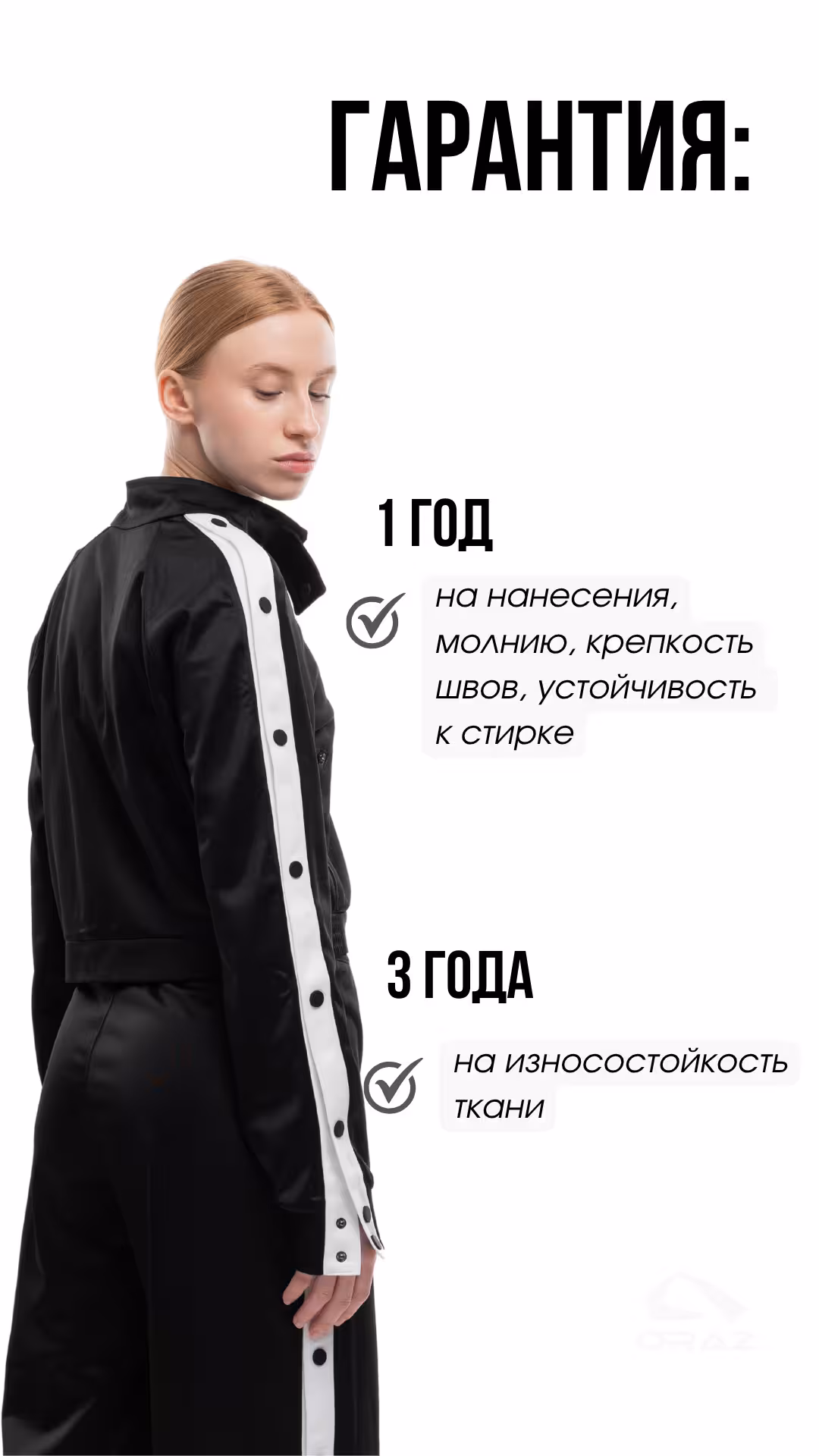 Даём гарантию 1 год на устойчивость термотрансфера, прочность швов, фурнитуру и износостойкость изделий из хлопка. И 3 года — на износостойкость изделий из синтетических тканей. Гарантия действует при соблюдении правил ухода, указанных на ярлыке. Если в течение срока вы обнаружите дефект, свяжитесь с менеджером — мы проведём экспертизу и решим вопрос.